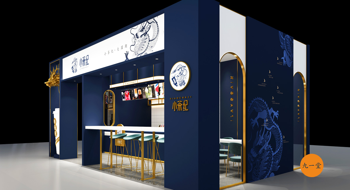 一葉神奇的東方樹(shù)葉,成為了風(fēng)靡世界的中國(guó)潮。中國(guó)是茶的故鄉(xiāng),成都是茶文化的起源地。小茶紀(jì),創(chuàng)建于成都,用一杯小茶紀(jì)成為風(fēng)靡世界的東方美茶潮流。在小茶紀(jì)的空間設(shè)計(jì)上采用深藍(lán)和金色色調(diào),體現(xiàn)小茶紀(jì)品牌的沉穩(wěn)的性格,但有沒(méi)有摒棄此品牌時(shí)尚的氣質(zhì),大面積鈦金的收邊提升了品牌整體品質(zhì)。門(mén)頭的形象墻采用龍頭的設(shè)計(jì)契合項(xiàng)目的品牌定位,體現(xiàn)出大國(guó)的豪邁,白色杯子的運(yùn)用使得整個(gè)空間時(shí)尚感十足。并且龍頭和杯子的運(yùn)用在此空間中十分搶眼,是整個(gè)空間的點(diǎn)金之筆。